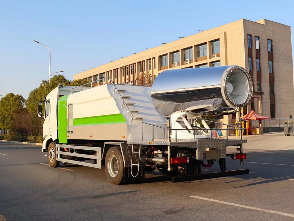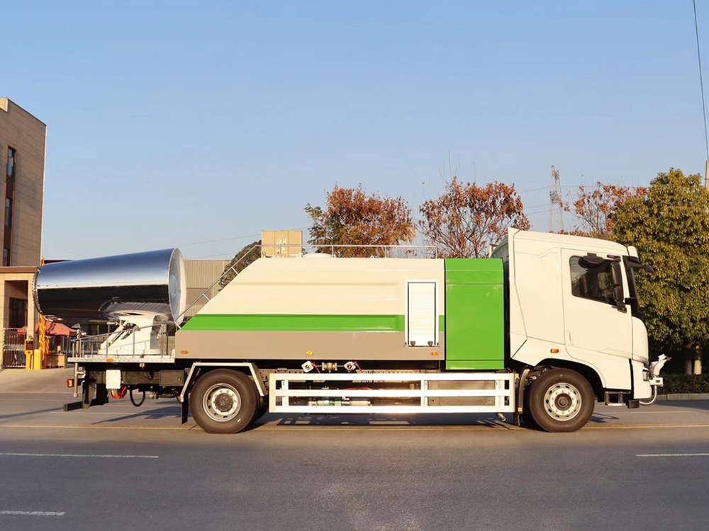 功能:前冲、后洒、侧喷、高压卷盘、后置80米不锈钢纯电动雾炮。