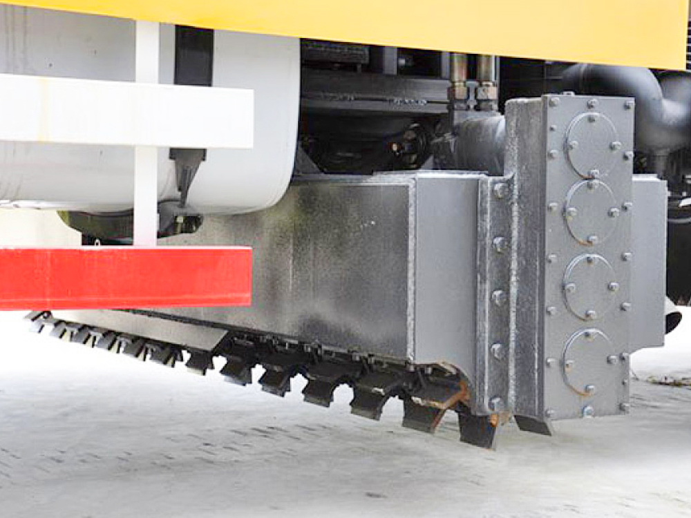 20、破冰装置采用双破冰辊形式,液压系统驱动前后破冰辊强力转动,在振动梁击振力的作用下,对冰雪路面进行纵向和横向冲击破碎,主要应用于压实雪和结冰路面。
