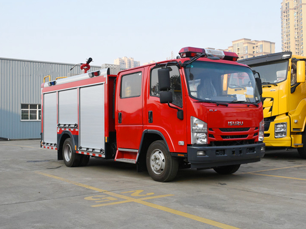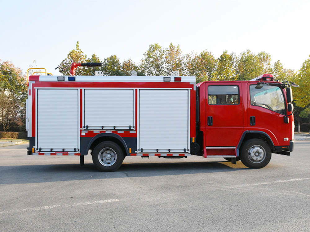 消防泵在箱体中间或者后置,泵房左右两侧4个出水口、器材箱左右后侧均有新款易拉高强度铝合金卷帘门。