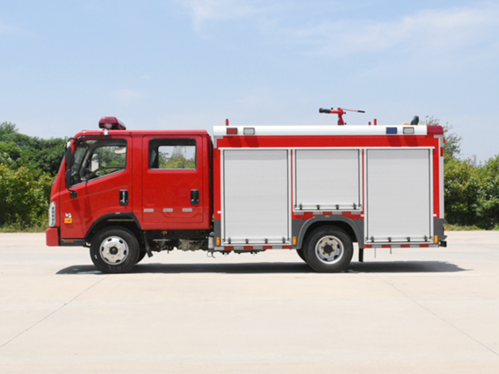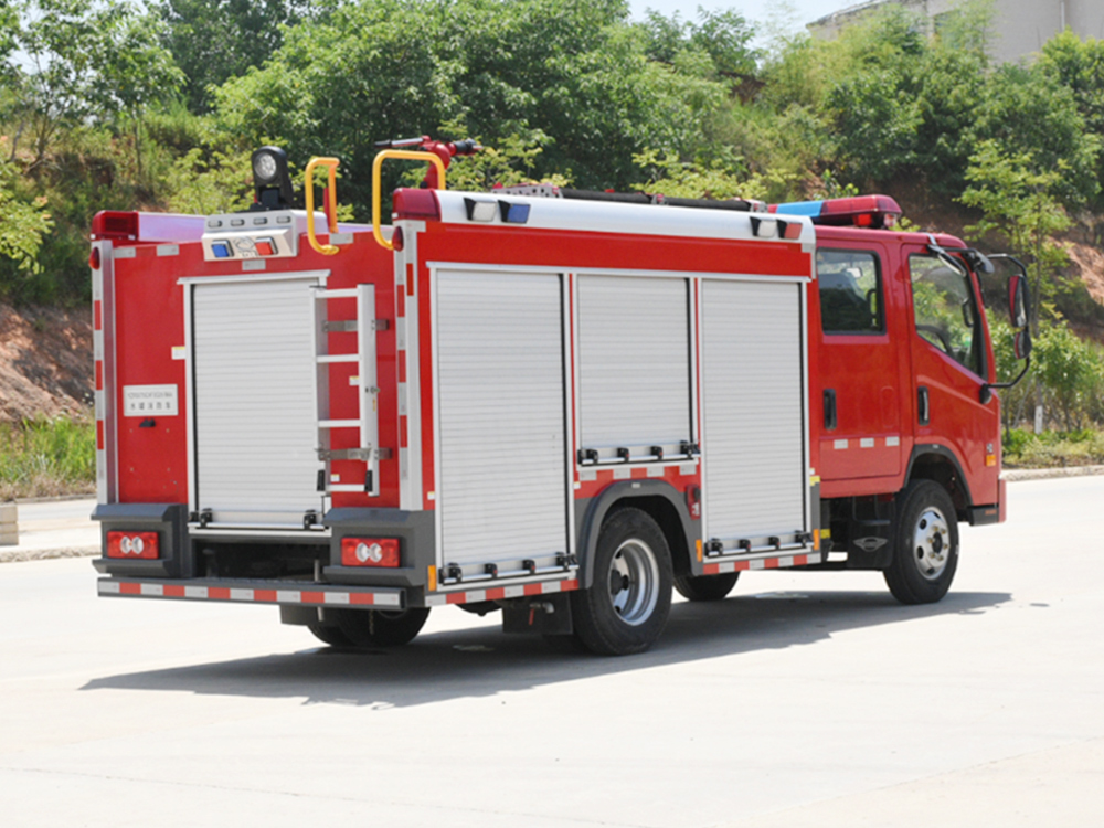消防泵在箱体中间或者后置,泵房左右两侧4个出水口、器材箱左右后侧均有新款易拉高强度铝合金卷帘门。