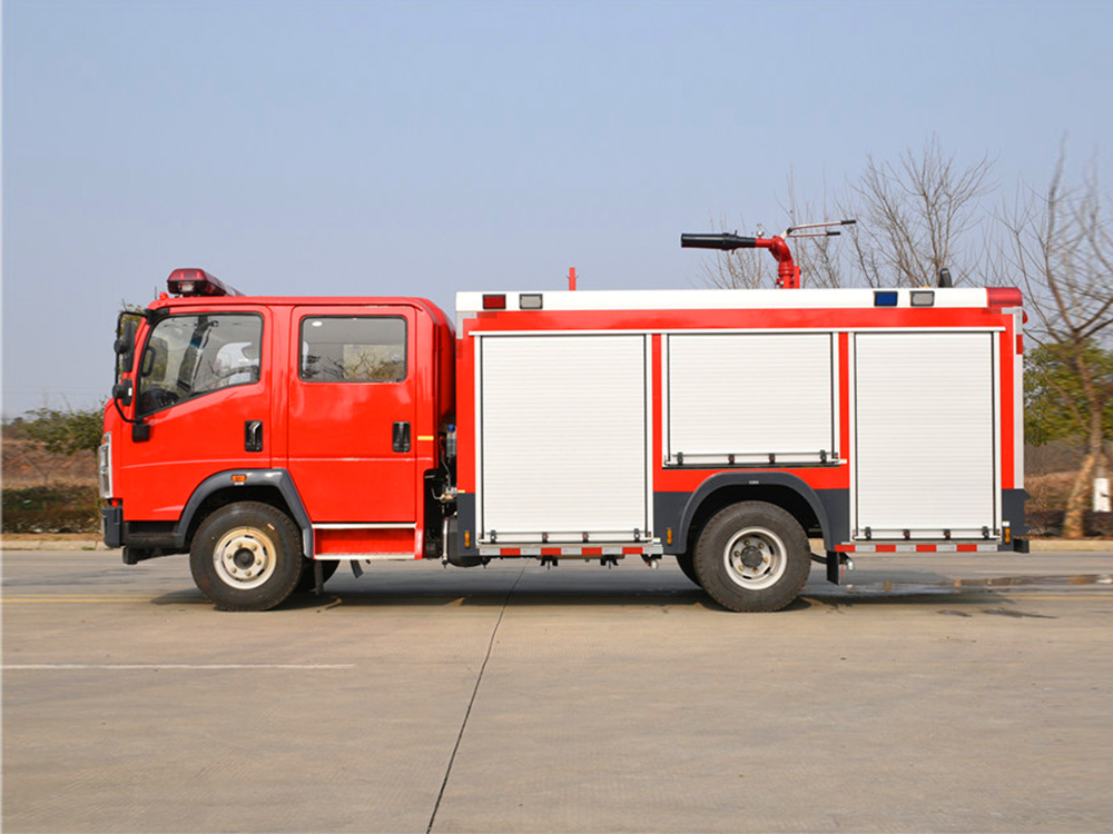 消防泵在箱体中间或者后置,泵房左右两侧4个出水口、器材箱左右后侧均有新款易拉高强度铝合金卷帘门。