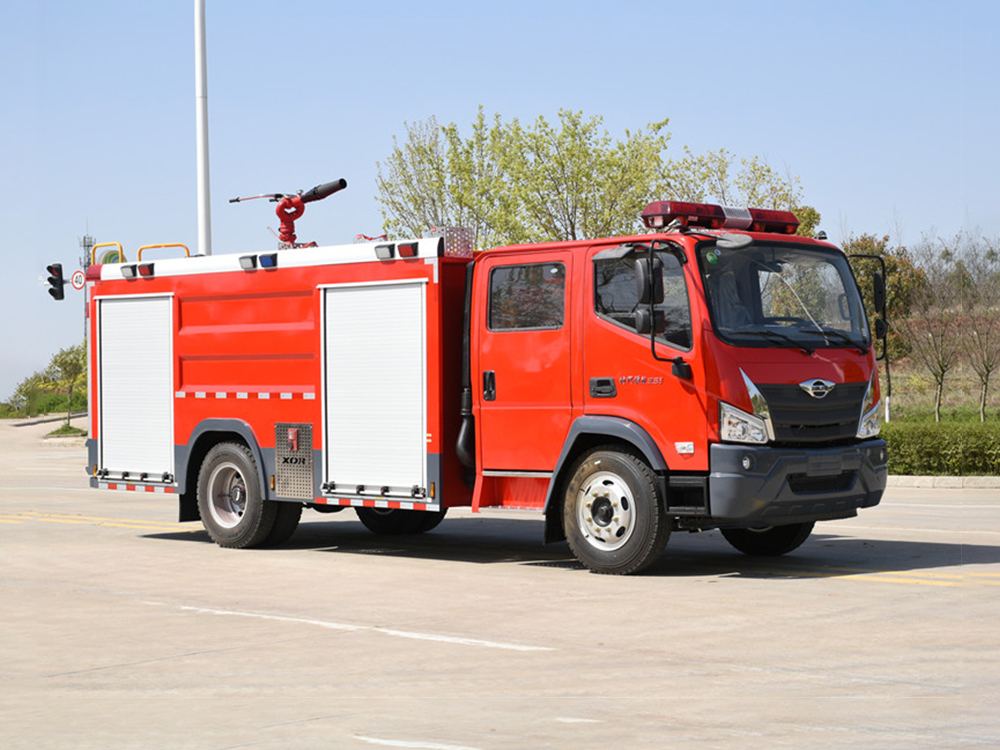 消防泵在箱体中间或者后置,泵房左右两侧4个出水口、器材箱左右后侧均有新款易拉高强度铝合金卷帘门。
