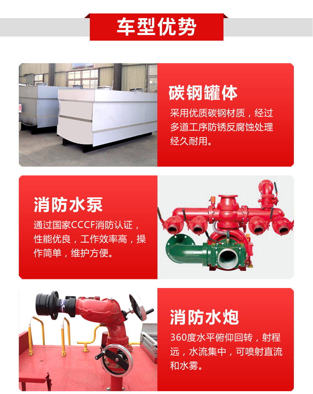 消防泵在箱体中间或者后置,泵房左右两侧4个出水口、器材箱左右后侧均有新款易拉高强度铝合金卷帘门。