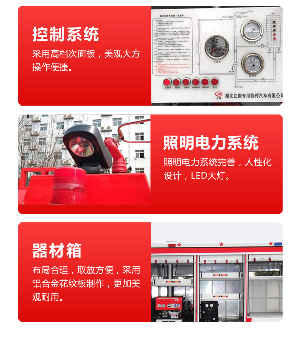 驾驶室顶部前端为长排100W**报器及**,车身后配有24V/60W火场照明灯一只,车辆两侧上方各配有红蓝相配的爆闪灯,下方安装安全标志灯,乘员室、器材箱、 泵房内均装有照明灯,回转**开关、通讯设备预备接口。