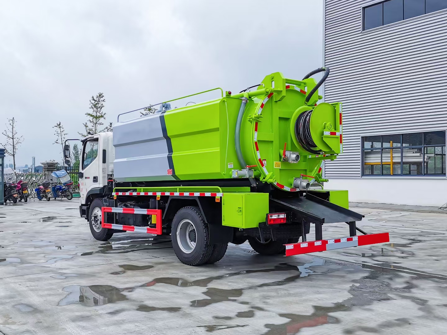 | 整车说明: | 该车装有取力器,高压水泵,高压水管,高压泵头,真空吸污泵以及水罐,吸污罐,用于清洗和吸污;整车长/轴距/罐体外形尺寸(长×直径)(mm)对应关系为:7350/3800/4200×1600,7750/4200/4500×1550,水罐罐体有效容积:3.72立方米,吸污罐罐体有效容积:4.65立方米,当轴距为3800时,水罐罐体外形尺寸(长×直径)(mm):1550×1600,吸污罐体外形尺寸(长×直径)(mm):2650×1600;当轴距为4200时,水罐罐体外形尺寸(长×直径)(mm):1650×1550,吸污罐体外形尺寸(长×直径)(mm):2850×1550;水罐和吸污罐为两个独立罐体,两罐不能同时满载.防护材料:Q235A碳钢,连接方式:左右侧面采用焊接连接,后下部防护采用焊接连接,后部防护断面尺寸(mm):150×60,后部防护离地高度(mm):480.ABS控制方式为4S/4M,ABS型号为CM4XL-4S/4M,生产厂家为广州瑞立科密汽车电子股份有限公司.随底盘选装驾驶室。 | ||