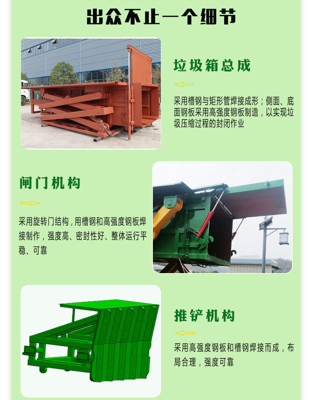 ★独有的推头机构设计有利于垃圾压缩过程排水排气,垃圾压实密度大于0.75t/m³。
