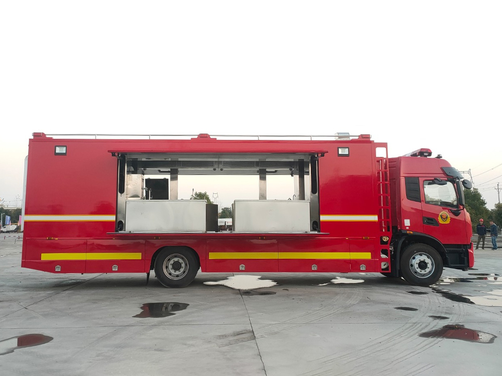 | 整车说明: | 1.仅采用轴距:5800mm;总长(mm)=前悬+轴距+后悬(mm)对应关系为:10700=1430+5800+3470.10700=1400+5800+3500.2.该车主要装置为集成灶台、蒸饭柜、车厢,用于野外烹饪食品,餐饮加工.3.后防护采用Q235,焊接连接,后防护截面尺寸:120mm×100mm,下边缘离地高470mm,裙边结构代替侧防护.离地高度为440mm.4.ABS型号/生产厂家:ABS 8/东科克诺尔商用车制动系统(十堰)有限公司,ABS-E 4S/4M/威伯科汽车控制系统(中国)有限公司.选装箱体外观.选装驾驶室,选装爬梯外观,选装内饰. | ||