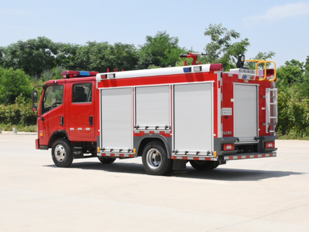 消防泵在箱体中间或者后置,泵房左右两侧4个出水口、器材箱左右后侧均有新款易拉高强度铝合金卷帘门。