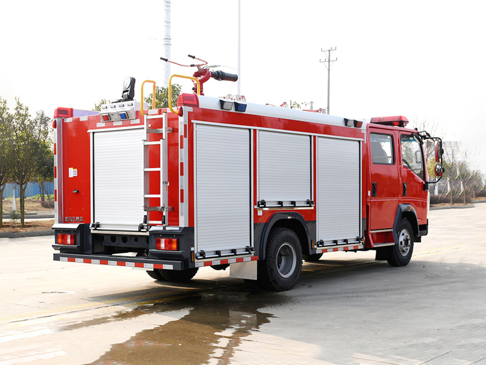 消防泵在箱体中间或者后置,泵房左右两侧4个出水口、器材箱左右后侧均有新款易拉高强度铝合金卷帘门。