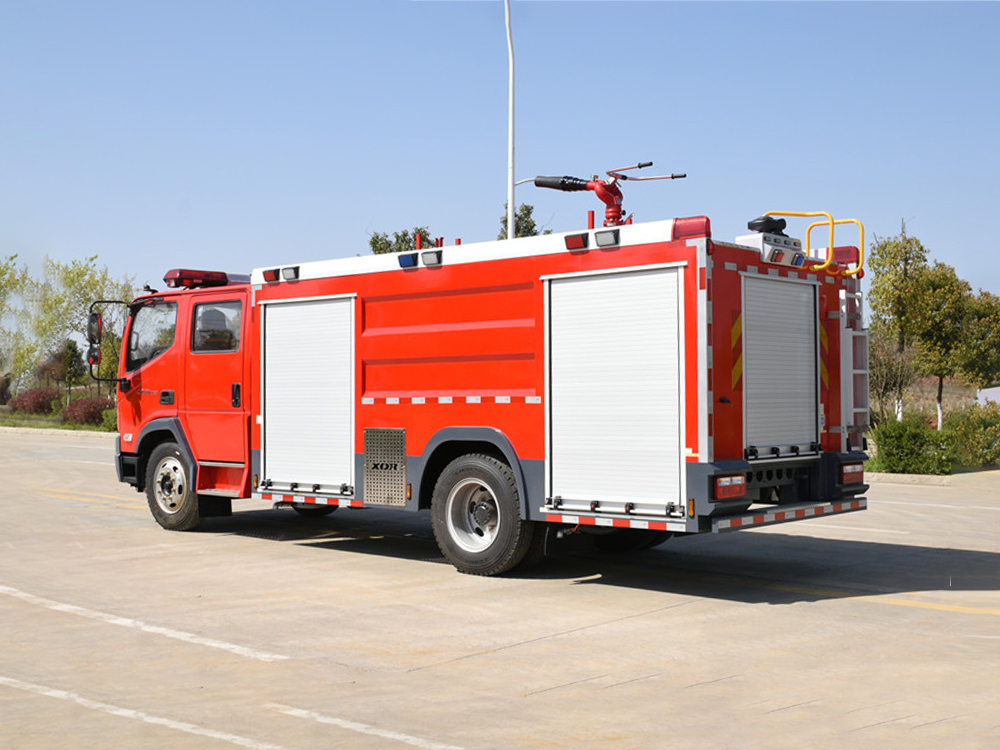 消防泵在箱体中间或者后置,泵房左右两侧4个出水口、器材箱左右后侧均有新款易拉高强度铝合金卷帘门。
