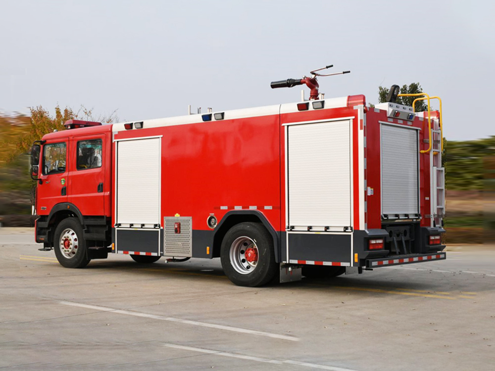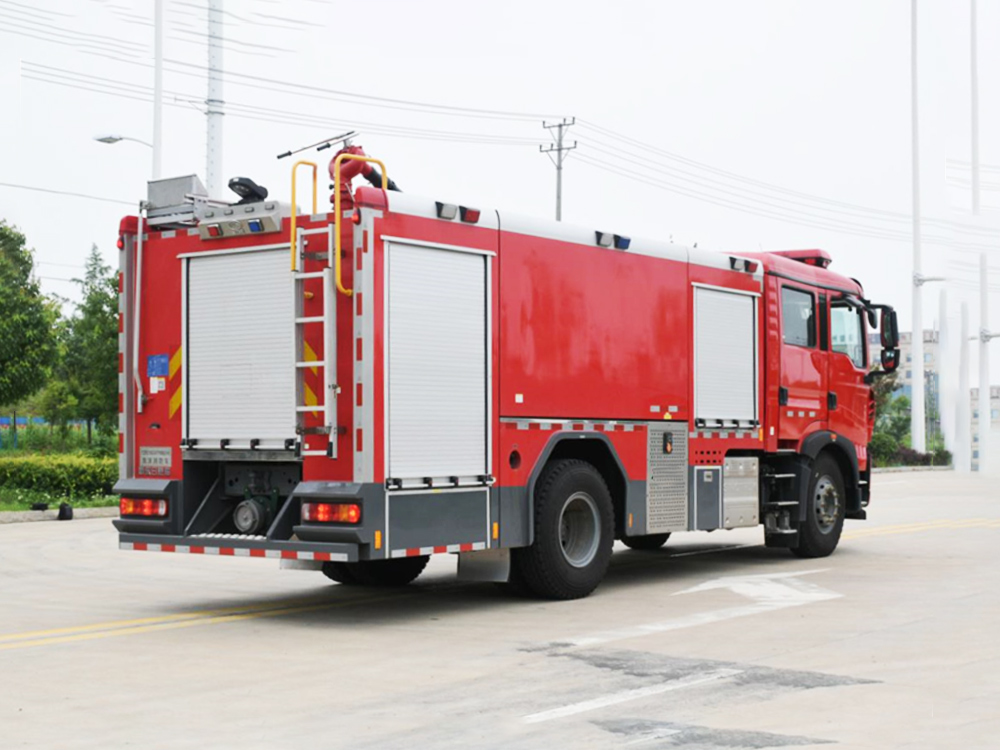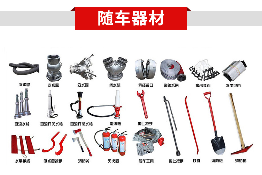 消防泵在箱体中间或者后置,泵房左右两侧4个出水口、器材箱左右后侧均有新款易拉高强度铝合金卷帘门。