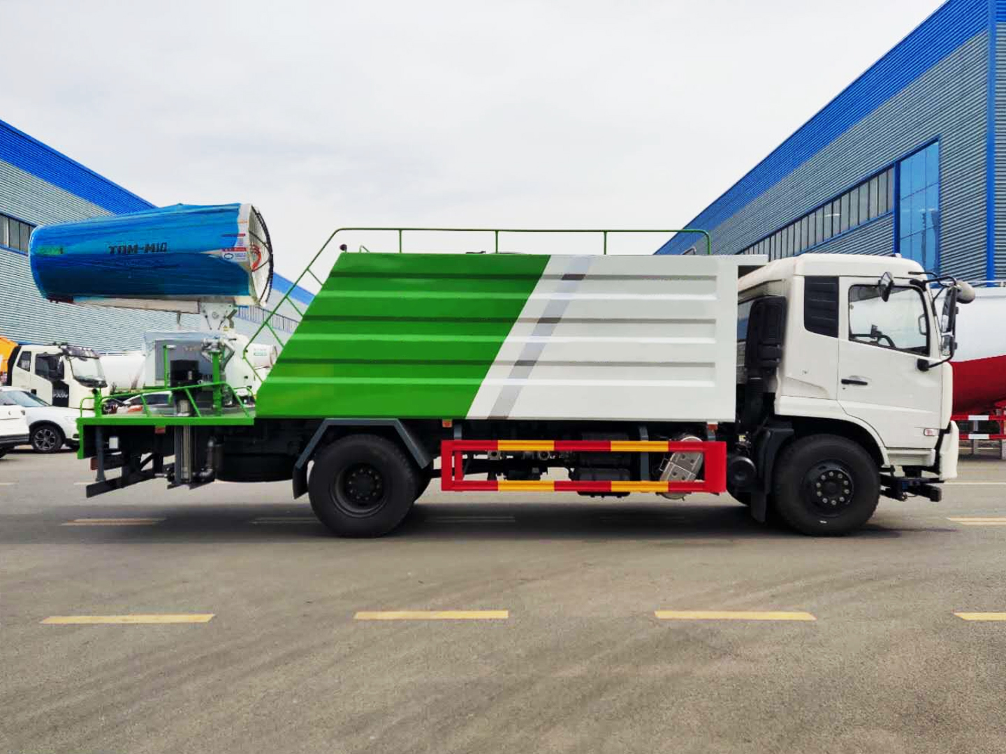 | 整车说明: | 1、该车主要用途为抑尘、降霾、除尘,主要专用装置为储液罐,喷雾装置.2、侧、后防护材料为Q235,连接方式为焊接连接,后防护装置断面尺寸(宽×高)50×120(mm),后防护离地高度:400mm.3、前伸尺寸:0mm,350mm;后伸尺寸:650mm,900mm;4、仅采用4700mm轴距的底盘,当选装80A雾炮,选装车辆前部不带喷洒装置时,前伸为0mm,后伸为650mm,整车外形长与前伸/前悬/轴距/后悬/后伸(mm)对应关系为:9550=0+1440+4700+2760+650,9550=0+1500+4700+2700+650,当选装100A雾炮,选装车辆前部不带喷洒装置时,前伸为0mm,后伸为900mm,整车外形长与前伸/前悬/轴距/后悬/后伸(mm)对应关系为:9800=0+1440+4700+2760+900,9800=0+1500+4700+2700+900,当选装100A雾炮,选装车辆前部带喷洒装置时,前伸为350mm,后伸为900mm,整车外形长与前伸/前悬/轴距/后悬/后伸(mm)对应关系为:10150=350+1440+4700+2760+900,10150=350+1500+4700+2700+900,当整备质量为9500kg,载质量为:8370kg(2人),8305kg(3人);当整备质量为9800kg,载质量为:8070kg(2人),8005kg(3人);5、异形罐体有效容积11.2立方米,罐体尺寸(长×宽×高)(mm)为:3700/4530×2450×1630.6、随底盘选装驶室,选装车辆前部不带喷洒装置,选装车辆后轮处安装喷洒装置;7、ABS型号/生产厂家:3631010-C2000/东科克诺尔商用车制动系统(十堰)有限公司,ABS-E 4S/4M/生产厂为威伯科汽车控制系统(中国)有限公司. | ||