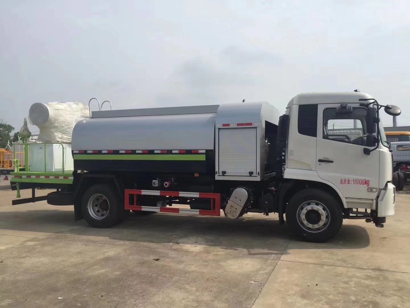 | 整车说明: | 专用装置为抑尘雾炮,用于城市抑尘。整车长/轴距/后悬对应关系为(mm):7890/3950/2540;8300/4200/2700;8700/4500/2800;9150/4700/3050;9150/4700/3020;9600/5000/3200;9900/5300/3200;10250/5800/3050.防护材料:Q235A碳钢,连接方式:左右侧面采用焊接连接。后下部防护采用螺栓连接,后部防护断面尺寸(mm):120×50,后部防护离地高度(mm):490。ABS型号/生产厂家:3631010-C2000/东科克诺尔商用车制动系统(十堰)有限公司,ABS 8/东科克诺尔商用车制动系统(十堰)有限公司, 4460046450/威伯科汽车控制系统(中国)有限公司。随底盘选装驾驶室。选装雾炮型号:WF-60/WF-80/WF-100所对应的整备质量分别为:9650kg/10600kg/11300kg。选装外形图片。 | ||