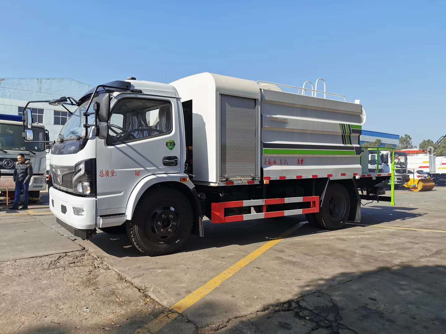 整车说明: 随底盘选装前面罩,前保险杠,前组合灯具,前雾灯。侧防护采用Q235,螺栓连接。后防护采用Q235,焊接连接。后防护截面高度尺寸120mm,截面宽度尺寸50mm,下边缘离地高度375mm。采用3800轴距底盘.ABS型号/厂家:ABS型号:ABS/ASR-24V-4S/4M,厂家:襄阳东风隆诚机械有限责任公司。该车用途为抑尘降霾,主要装置为水罐及喷雾装置。选装后平台样式,外观样式,左右出水口及附件位置。